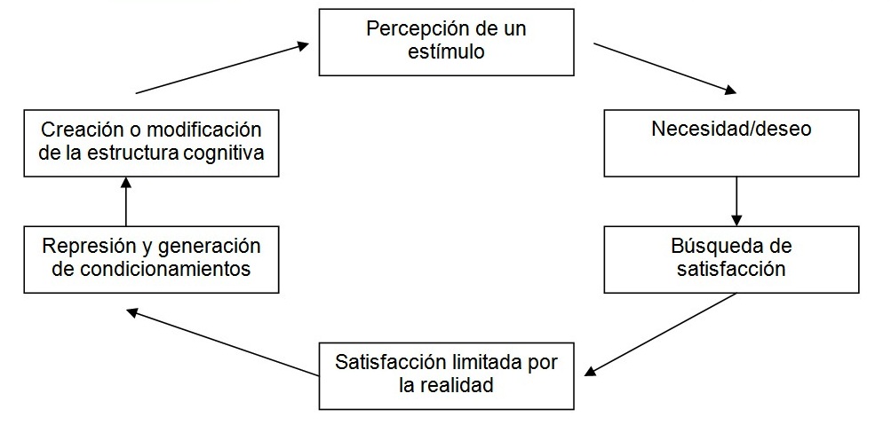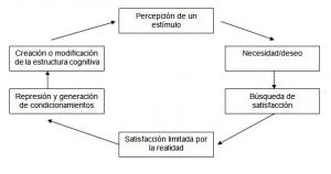 Percepción de un estímulo→necesidad/deseo→búsqueda de satisfacción→satisfacción limitada por la realidad→represión y generación de condicionamientos→creación o modificación de la estructura cognitiva.